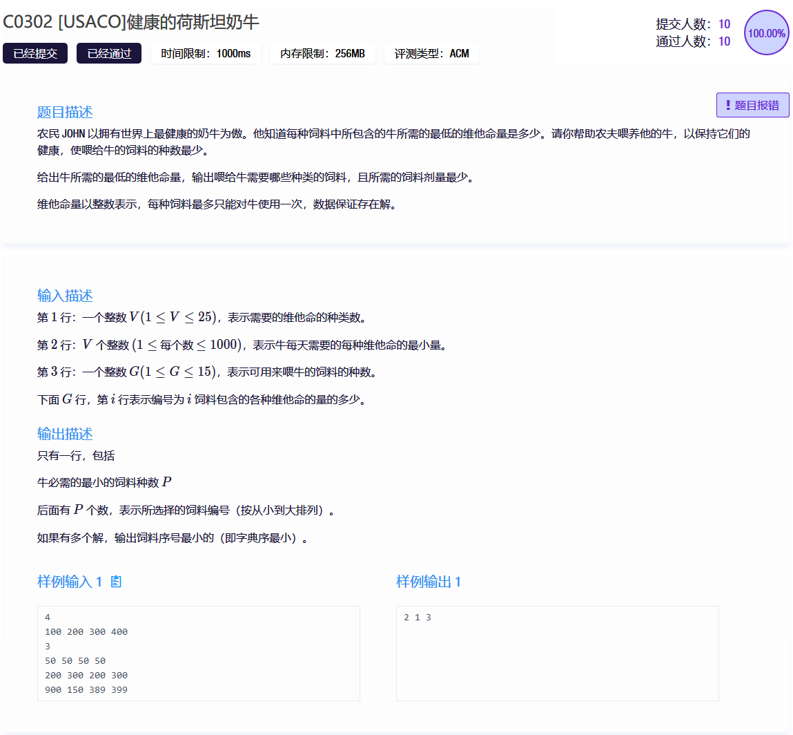 递归中止的条件是最后一种饲料是否选择亦考虑完毕。 进入每层递归,即正在判断每种可能的选择时,统计已选择的饲料含有的每种维生素数量是否都满足要求。如果满足,且当前方案选择的饲料种类数比已有方案更少,就将最少方案更新为当前的方案。用长度为 15 的 bitset b 和 b0 分别保存当前的选择方案和已经发现的最优选择方案。 第 cur 种饲料选择后,要将该饲料含有的各种维生素的数量加入到已选的饲料可提供的每种维生素的总数中,这个总数用数组 s 表示。当枚举不选择该种饲料的情形时,相应的维生素数量要扣除。#include#include using namespace std;#pragma warning(disable:4996)unsigned V, m[25], G, c[15][25], s[25]; bitset<15> b, b0; bool ok;void dfs(const unsigned& cur) { ok = true; for (unsigned i = 0; i < V; ++i)if (s[i] < m[i])ok = false; if (ok == true && b.count() < b0.count()) { b0 = b; } if (cur == G)return; b[cur] = 1; for (unsigned i = 0; i < V; ++i) { s[i] += c[cur][i]; } dfs(cur + 1); b[cur] = 0; for (unsigned i = 0; i < V; ++i)s[i] -= c[cur][i]; dfs(cur + 1);}int main() { scanf("%u", &V); for (unsigned i = 0; i < V; ++i)scanf("%u", &m[i]); scanf("%u", &G); for (unsigned i = 0; i < G; ++i) for (unsigned j = 0; j < V; ++j) scanf("%u", &c[i][j]); b0.set(); dfs(0); printf("%u", b0.count()); for (unsigned i = 0, j = 0; j < b0.count(); ++i)if (b0[i] == true) { printf(" %u", i + 1); ++j; } return 0;}